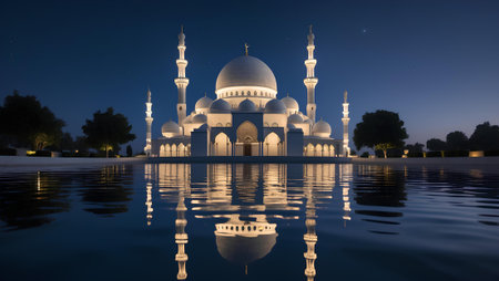 Majestic Mosque at Sunset Reflecting on Water Surface