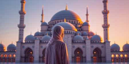 The stunning silhouette of a mosque towers above tranquil waters, illuminated by the soft morning light.