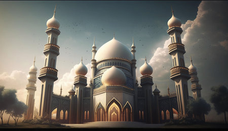 Majestic Mosque Under Misty Skies: An Architectural Dream