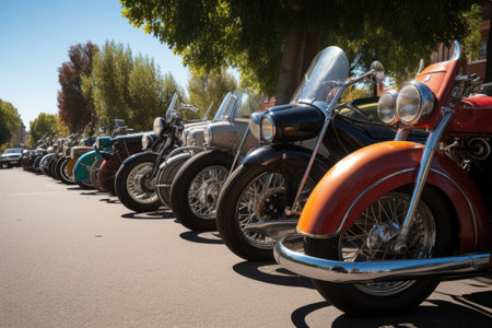 classic cars and motorcycles arranged in a row on a sunny day, created with generative ai