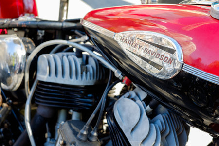 MIAMI, FLORIDA USA - APRIL 12, 2014 Close up of a vintage Harley Davidson motorcycle on display at the Old Soul Young Blood Vintage Motorcycle festival