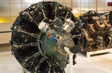 Old turboprop part, vintage airplane closeup metal details in historic museum