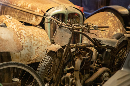 old rusty car motorcycle rust vintage motorbike and classic car wreck stored in ancient barn garage collection