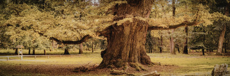 A large, ancient tree stands prominently in a lush, green forest. The tree's massive trunk and sprawling branches are surrounded by vibrant autumn foliage, creating a tranquil and picturesque scene.