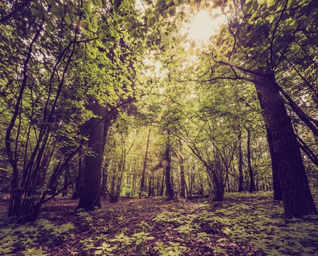 Vintage photo of summer or autumnal forest. Beautiful wild european forest