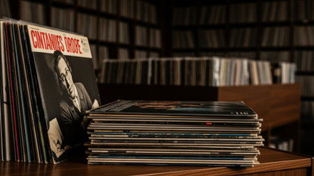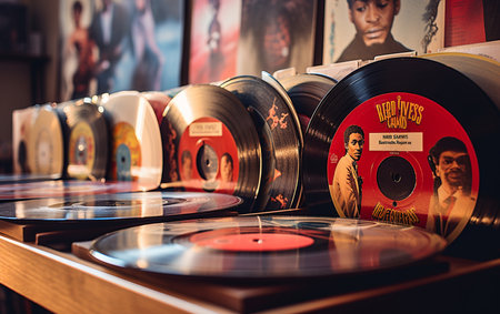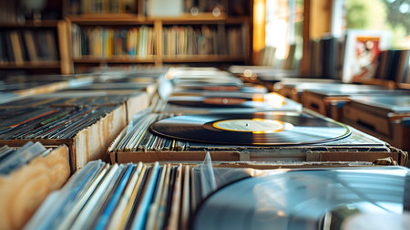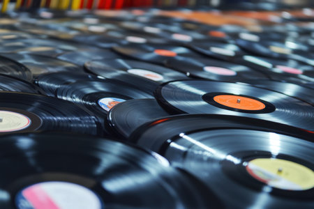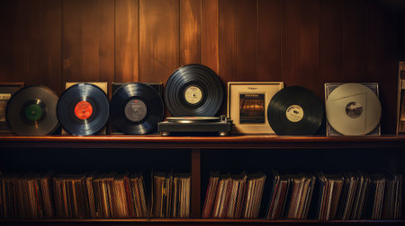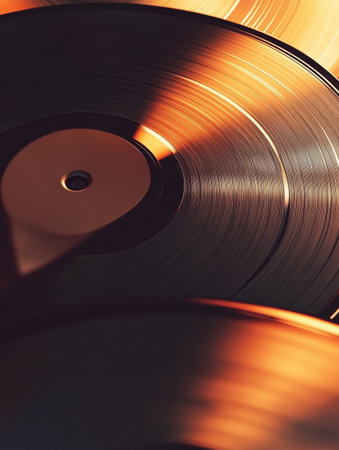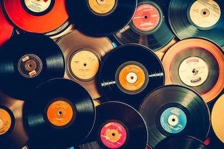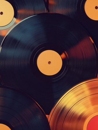 A close up view of several vintage vinyl records illuminated by soft light, creating a nostalgic atmosphere and providing space for text.
