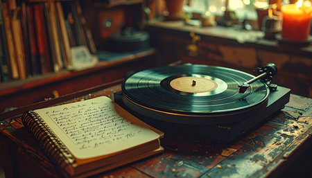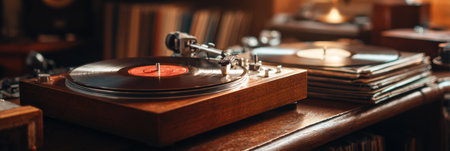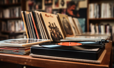 In a quiet, cozy room filled with books, a vintage turntable spins a favorite vinyl record.