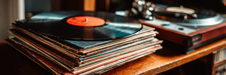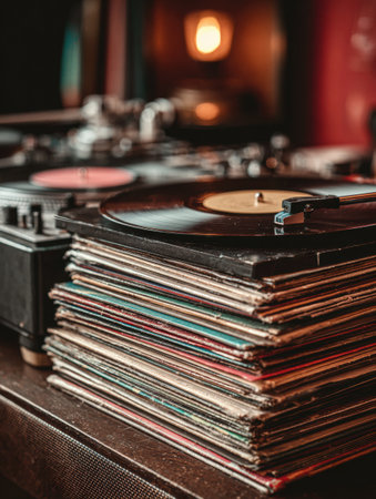 A collection of vinyl records is neatly stacked next to a turntable in a warm and inviting music lounge, creating a nostalgic and cozy ambiance.