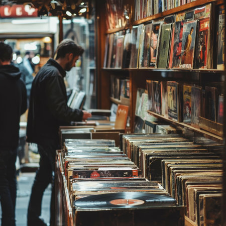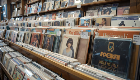 Exploring a Cozy Vintage Vinyl Record Store Surrounded by Shelves Filled with Analog Music Treasures from the Past