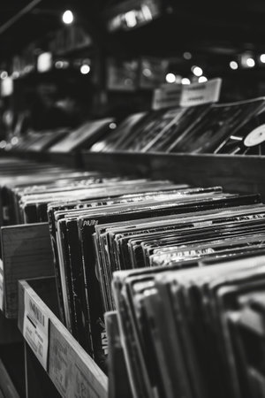 close up of a vinyl record in a music store, shallow depth of field