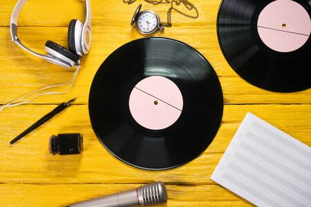 Retro vinyl record, music book, microphone and speakers on yellow flat lay background.