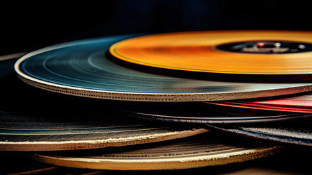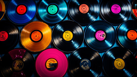 Colorful vintage vinyl records are creatively arranged in a 3D pattern against a dark backdrop, with ample copy space available for text.