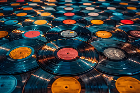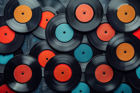 Colorful vinyl records floating in a vibrant background, creating a retro music atmosphere.