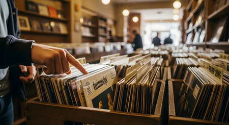 A person's hand is shown from a close-up, low-angle perspective, flipping through a crate of black vinyl records in a record store. The shelves are filled with albums, and the warm, slightly dusty atmosphere evokes a sense of nostalgia. The image captures the experience and love for finding new music in a physical format.