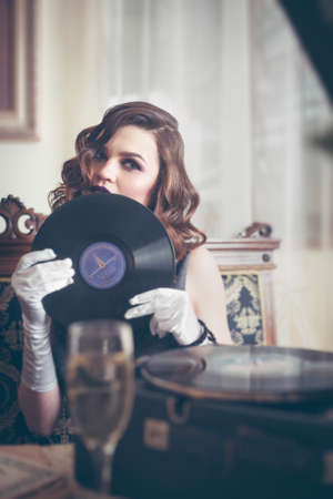 Young beautiful woman in retro style, with a vinyl record. Vintage interior. Studio photo.