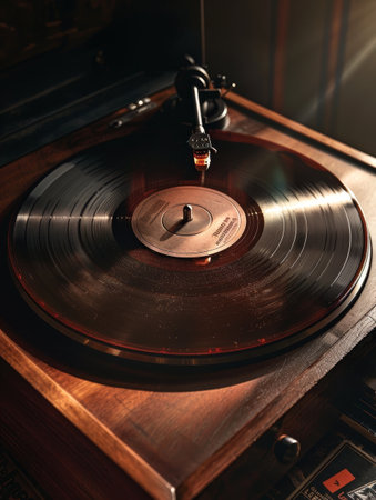 Close-up of a vintage vinyl record spinning on a turntable, capturing the nostalgia and warmth of analog music playback. The image highlights the grooves and red label of the record.