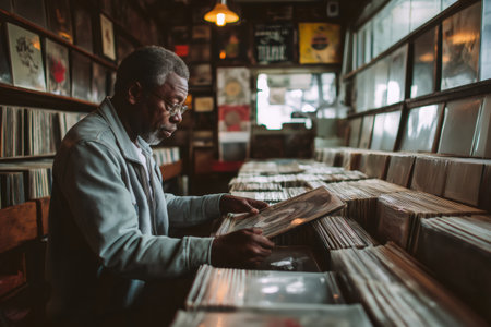 Elderly man browsing vinyl records in a record store, enjoying his passion for music and searching for rare albums