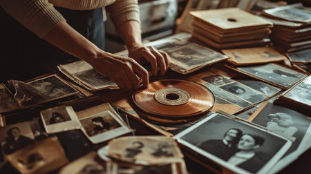 A person carefully examines vintage records and photographs spread across a wooden table, reflecting a sense of nostalgia and connection to the past in a warm atmosphere.