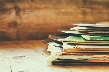 selective focus of records stack with record on top over wooden table. vintage filtered