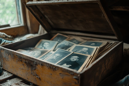 A weathered wooden box sits open near a window, revealing a collection of vintage black-and-white photographs. Dust particles dance in the sunlight filtering through the glass.