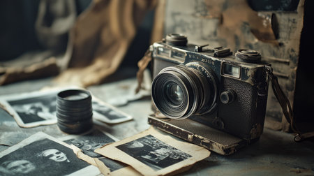 A vintage camera rests on a rustic table surrounded by old photos, creating a nostalgic atmosphere. Ideal for themes of memory, history, and photography.
