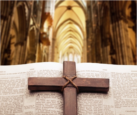 A woman who believes in a higher power is pictured holding a wooden cross on an open holy bible.