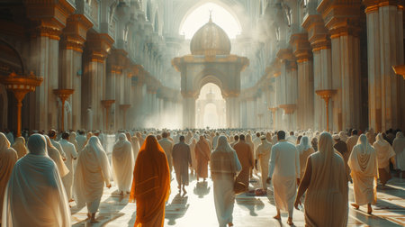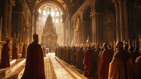 A priest enveloped in golden sunlight within a grand cathedral, his ornate robe detailed against the backdrop of glowing candles and stained glass. priest