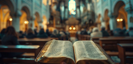 Hands holding open Holy Bible inside Church with blurred cross and lights in background