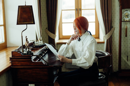 Red haired woman wearing a white blouse is sitting at a wooden desk, intently reading a letter, in a vintage study room with sunlight streaming through the windows