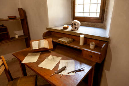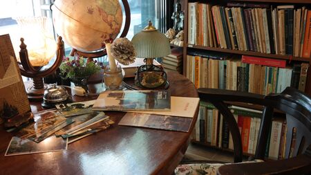 Saint-Petersburg, Russia - 21 March, 2021: Memorial apartment of Alexander Pushkin in Saint Petersburg, fomous poet. Library interior of russian writer with chair and working desk