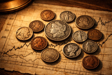 A close-up, high-angle view of a collection of antique and vintage coins, including various denominations and metals, artfully arranged on a weathered, yellowed paper featuring a hand-drawn financial chart or stock market graph. The warm, dramatic lighting enhances the aged texture of the paper and the intricate details of the historical currency, evoking themes of finance, economics, investment, history, and numismatics. Perfect for illustrating concepts of wealth, market trends, or collecting.