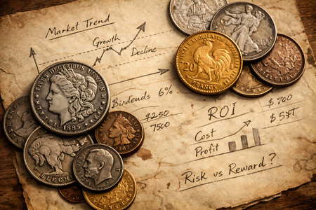 A detailed flat lay of various antique gold and silver coins, including historical Francs and American currency, resting on an aged, textured paper. The paper features handwritten financial notes, market trend graphs showing growth and decline, ROI calculations, cost, profit breakdowns, and a thought-provoking "Risk vs Reward?" question, embodying classic economic principles and historical investment themes.