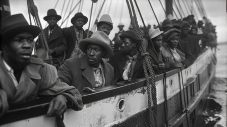 Historic Arrival: African Immigrants on a Ship During Windrush Era