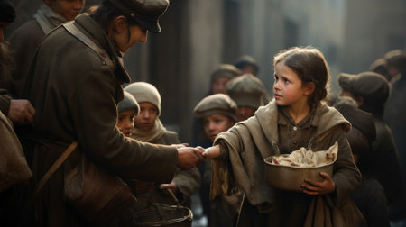 Three children sit together on a cobblestone street, dressed in vintage clothing typical of a past era. They appear to be reflecting, with serious expressions that convey a sense of resilience and nostalgia, surrounded by an urban backdrop.