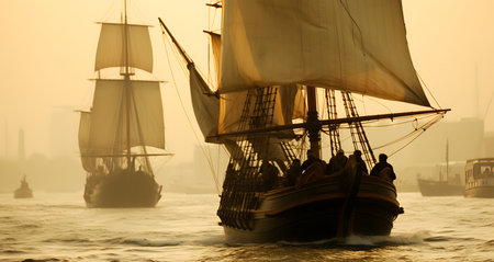French musketeers walking towards tall ships sailing on the Saint Lawrence River at sunset in New France during the 17th century