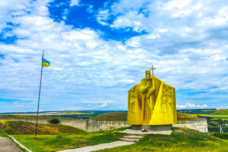 Khotyn Fortress Complex Ukrainian Hetman Petro Konashevych Sahaidachny Monument with Waving Ukraine Flag