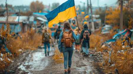 A poignant scene at a refugee camp with individuals carrying the Ukraine flag, walking down a muddy path, showcasing the enduring spirit and hope amidst crisis.