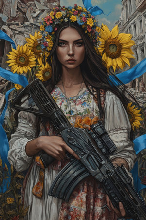 The portrait features a Ukrainian woman adorned with a flower crown, clutching a firearm. She embodies strength and resilience, surrounded by vibrant sunflowers and remnants of destruction.