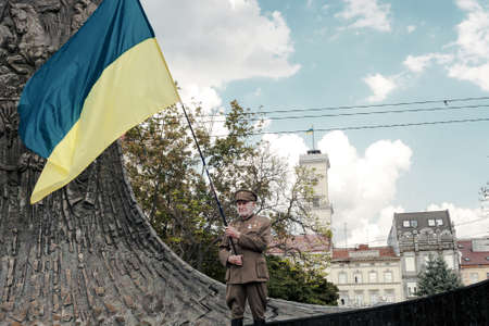 Lviv, Ukraine - 24 August 2018: Ukrainian Independence Day. Senior in military uniform holding national flag