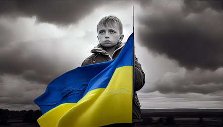 Little boy holding Ukrainian flag with cloudy sky background. Ukrainian crisis concept