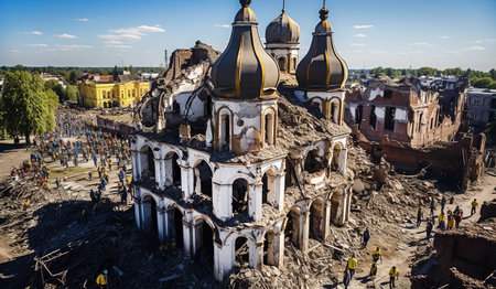 War in Ukraine, burned, destroyed cathedral, people stay on ruins of chirch.