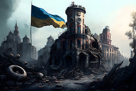 A solitary figure approaches a billowing Ukrainian flag in a war-torn landscape. The scene symbolizes unwavering courage in the face of adversity. AI generation AI generation