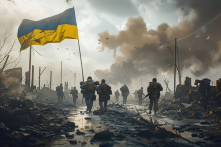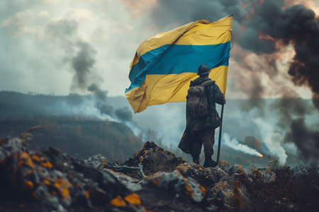 Ukrainian soldier with flag amidst ruins a cinematic perspective of resilience and hope