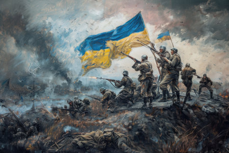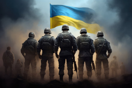 Conceptual ukrainian flag with ukraine soldiers. Al generated illustration