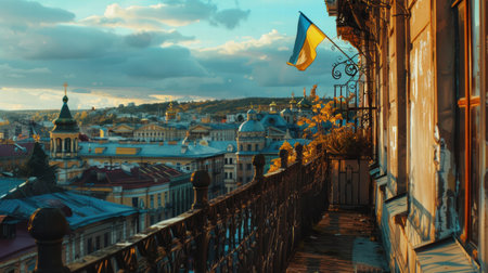 Aerial view of the Ukrainian flag waving in the wind against the city of Kyiv