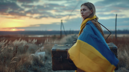 A displaced Ukrainian woman stands at the border, waiting for a new beginning.