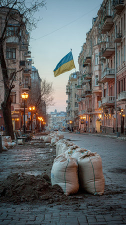 Sandbags lining an empty street in kyiv at sunset, showcasing buildings under the ukrainian flag, reflecting resilience amidst conflict