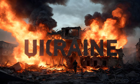 The word UKRAINE emerges from the flames and debris, a stark symbol amidst devastation, signifying both tragedy and the indomitable spirit of a nation.