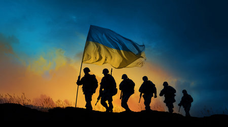 Soldiers march holding the Ukrainian flag at sunset, symbolizing resilience and determination during challenging times