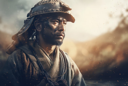 Zen samurai portrait nature sunset. Face japan man kimono costume. Generate Ai